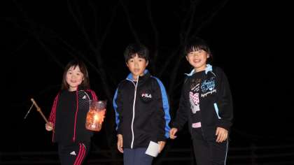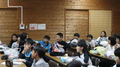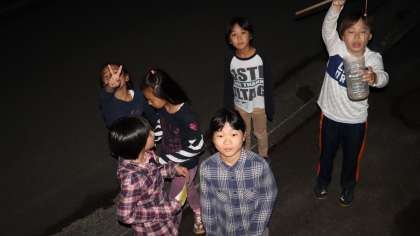 昨晩の活動はナイトハイクでした。「夜になると徘徊する魔王をたおすためのお札を手に入れてゴールする」というゲーム形式のナイトハイクです。コースを回っている途中にもし魔王に出会ってしまったら,気付かれないようにかくれたり,逃げたりしなければなりません。魔王に出会った子どもたちは,息をひそめてかくれていました。そして無事に全グループお札を手に入れてゴールすることができました。子どもたちは魔王の正体が誰なのか,考えていました。果たして,誰だったのでしょう。