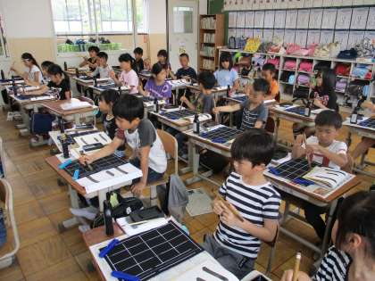 6時間目は墨をつけて、半紙に初めて書きました。