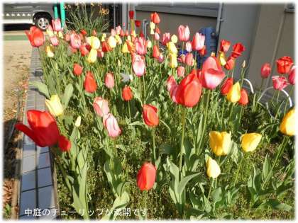 咲く時期が微妙にずれているので,1週間以上色とりどりのチューリップが咲いています。