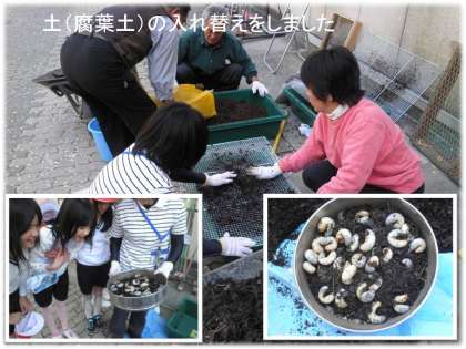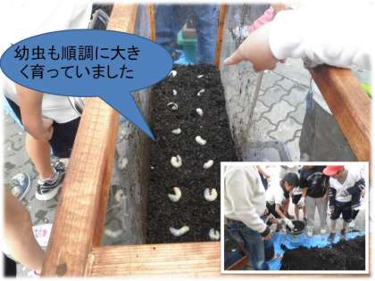 幼虫は,順調に成長していて元気に動いていました。子どもたちは,軍手をはめて慎重に幼虫を新しい腐葉土の中に入れていました。