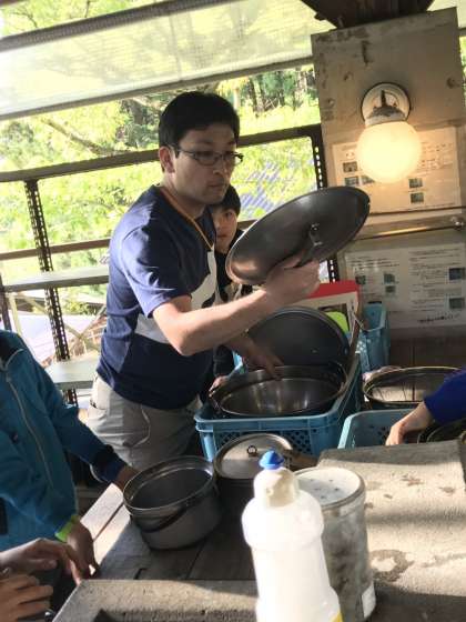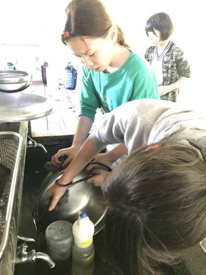 食べ終わった後はみんなできちんと片づけです。黒いすすや油などがきれいに落ちるように何度も洗いました。教頭先生にチェックしてもらい,最後までしっかりやりきりました。