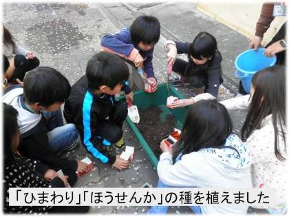 一人ひとりポットを牛乳パックで作り,「ひまわり」と「ほうせんか」の種を植えました。