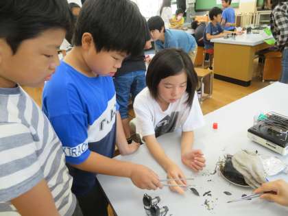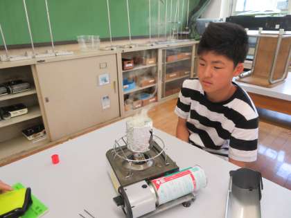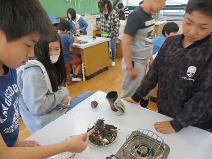 「ものの燃え方」学習で,木を空気の無いところで熱し続けると炭になることを知りました。今回は花や竹など,学校の運動場やビオトープで見つけたものが炭になるのか実験しました。