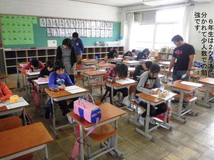 6年生は,2クラスに分かれて少人数での学習です。6年生にも7人の先生が入っています。習熟度に合わせての個別指導です。