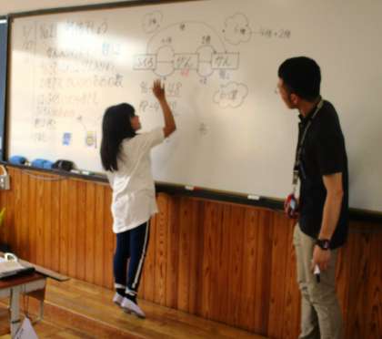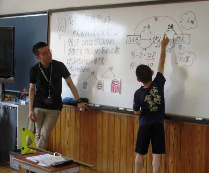 何倍になるかな?順番に考える場合と,まとめて考える場合について図を使って,話し合っています。