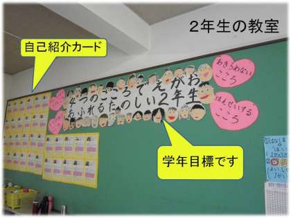 2年生の学年(学級)目標が大きく掲示されています。この目標は,先週に先生と子どもたちで考えたものです。