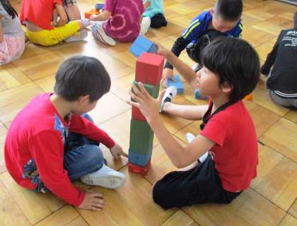 ブロックに触りながら,いろいろなかたちに親しんでいます。