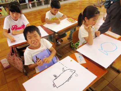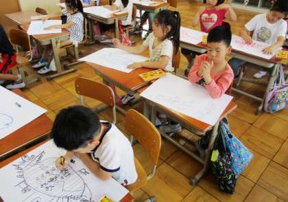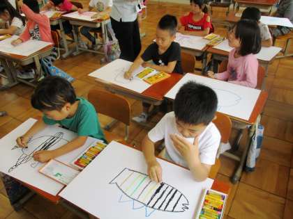見たこともない素敵な魚を描いています。それぞれ名前を付けたり,イメージを伝えたりしながら楽しく描きました。