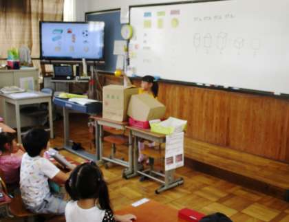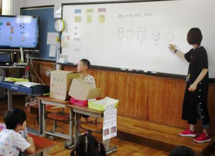 かたちクイズをしています。「丸」「四角」だけでなく,「細長い」など説明する言葉を工夫しながら楽しく学習しました。