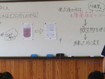 自分たちが使っている「水」がどのようにしてやってくるのかは,社会見学等でしっかりと学習しました。今,学習しているのは使ったあとの水がどうなるのかです。自分たちの生活に身近なこの学習,しっかりと調べていってほしいと思います。
