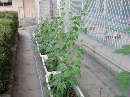 日に日にツルがのびて,葉もどんどん大きくなってきています。もう2メートル以上のびているヘブンリーブルーもあります。ゴーヤの方も花がさきはじめています。