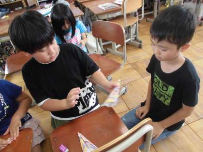 紙飛行機ゲームでは,3くみのお友達が3年生に折り方を教えている姿が見られました。