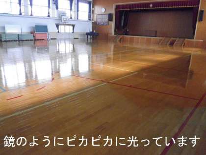 見事にリニューアルされた体育館の床は,鏡のようにピカピカ光ってきれいになりました。