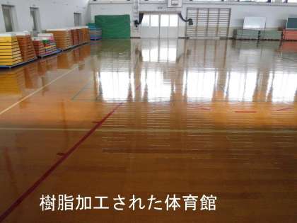 週末の休日(土日)を利用して,長年の使用で,つやもなくなり,傷だらけだった体育館の床を磨きなおして,樹脂加工してもらいました。