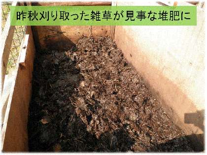 昨秋に入れた雑草の堆肥箱を開けてみると,たった4〜5か月で見事な堆肥にかわっていました。