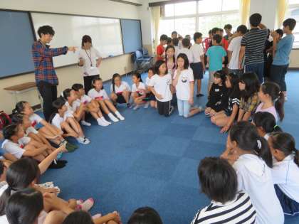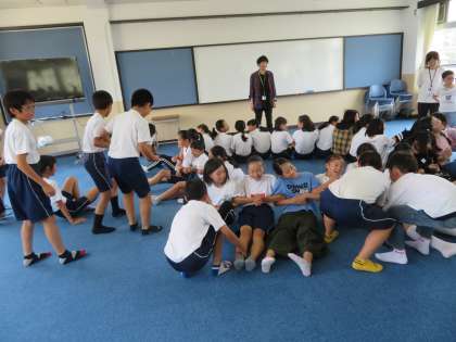 交流の日,お互いにあいさつを済ませた後,多目的室でアイスブレイクを行いました。まずは,男子と女子に分かれて,「バースデーライン」というゲームを行いました。声を出さずに,お互いの誕生日を教え合い,誕生日の順番に並び替え,円になって座るゲームです。声を出さないルールですが,思わず声を出してしまう場面も!しかし,それもお互いの心をさらにほぐしていくきっかけとなりました。