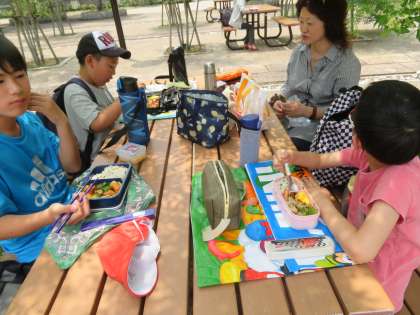 龍安寺に行った後は,昼食です。昼食は立命館大学のひろばで食べました。バス停から龍安寺への歩き道,龍安寺から昼食場所への移動に立命館大学の敷地を通りました。大学がどんなところか見たことがない子どもがほとんどですので,そういった場所を見ることができたのも子どもたちにとってよい経験になったと思います。