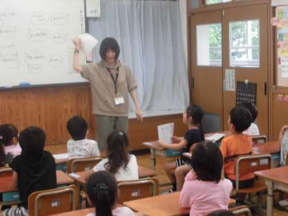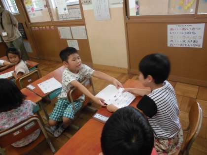 今回は,プリントをわたすときに「はい,どうぞ。」,「ありがとう。」のやり取りをしました。