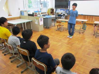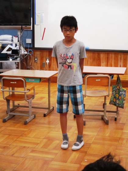 昨日の5年生との共同学習のふりかえりを発表しています。名前を覚えることができたり,協力できたりしたことが心に残っていたようです。