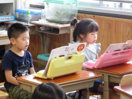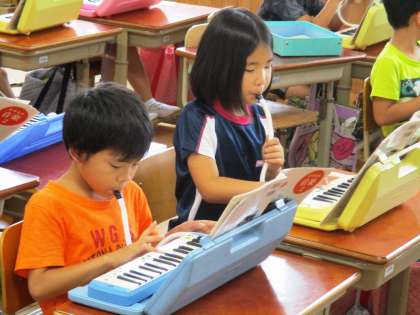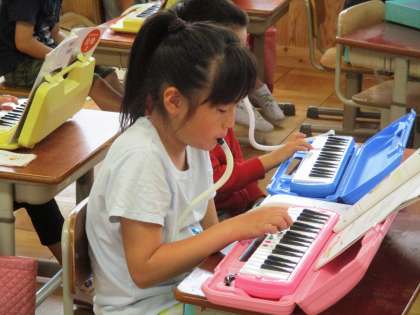 けんばんハーモニカと歌に分かれて練習しています。