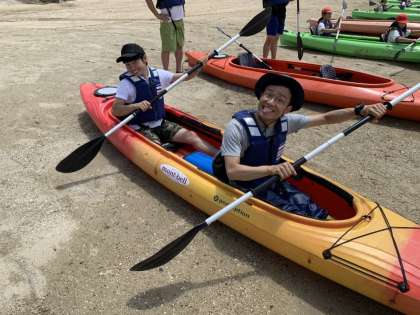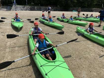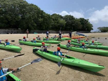 昼食の後は,いちばん最初の活動「シーカヤック」です。シーカヤックの乗り方を教えてもらい,いよいよ本番です。みんなどきどきわくわくしています。