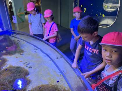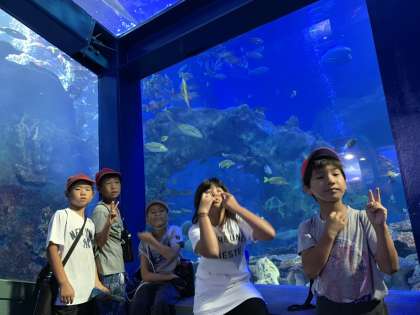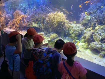 グループごとに,館内を回っています。子どもたちは,いろいろな魚を見て大興奮です。
