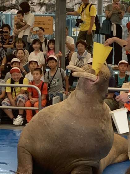 セイウチショーが始まりました!飼育委員さんの指示に合わせてショーを行うセイウチに「オオー!」という声があがっています。セイウチにさわることもできました。子ども達もとてもうれしそうです。