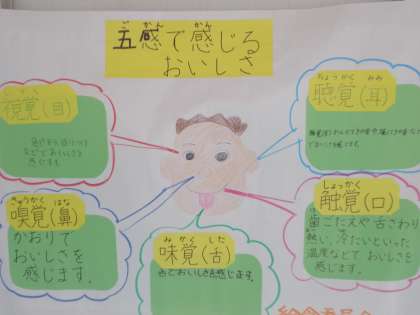 給食室のわたりろうかやサービスホールに,栄養士の先生や給食担当の先生が給食をおいしく食べるための基礎知識を,わかりやすく絵入りで掲示していただいています。