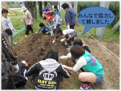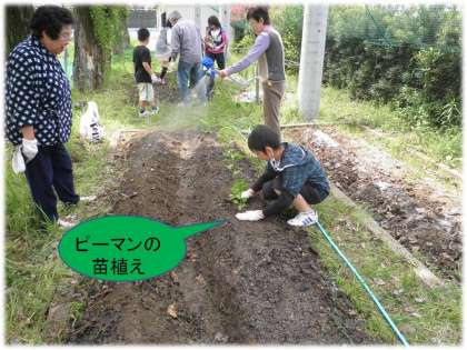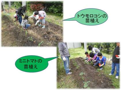 準備が整ったところで,子どもたちと合流し,畑の土の作り方から野菜の苗の植え方まで,ていねいに説明してくださり,子どもたちの手で植えていきました。
