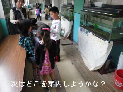 お兄さん,お姉さんになって1年生を連れて,学校探検(案内)をしました。