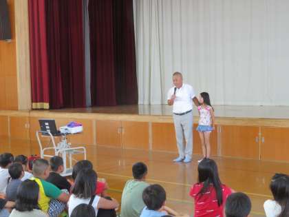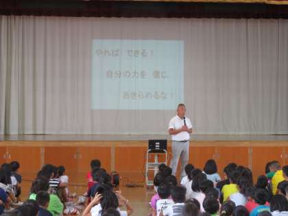 そして,夏休み中に活躍した友だちの表彰を行いました。特に,6年生は全日本ジュニア・ユース綱引選手権大会で「3位」という見事な成績を収めました。6年生のがんばりを全校児童でたたえることができました。6年生がこのような成績を収めることができたのは,最後まであきらめなかったからです。この6年生の姿をお手本に全校にみんなが「やればできる。」「最後まであきらめない。」ことを実践してほしいと願っています。