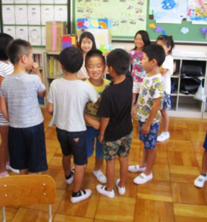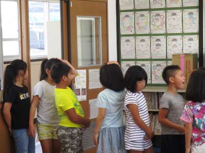 席替えをしました。みんなの意見から背の順で席替えをすることになりました。みんなで協力して,まずは背の順に並んでいます。
