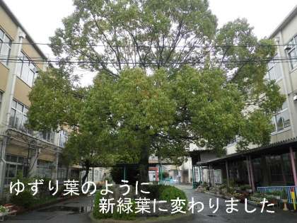 また,学校のシンボル「クスノキ」もほぼ茶色の古い葉が落ち,濃い緑の新葉に変わりました。