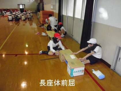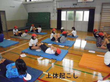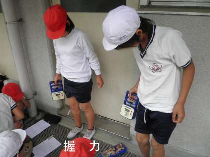 屋内での種目の中の,「上体起こし」「長座体前屈」「反復横とび」「立ち幅跳び」「握力」をローテーションを組んで回りました。