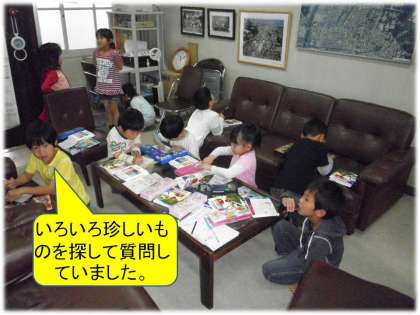 「お客さま用のスリッパ,ソファー」「学校の昔の写真」「今までの校長先生の写真」「電話」「・・・」等々,みつけては,「校長先生,これ何??」と質問をしていました。