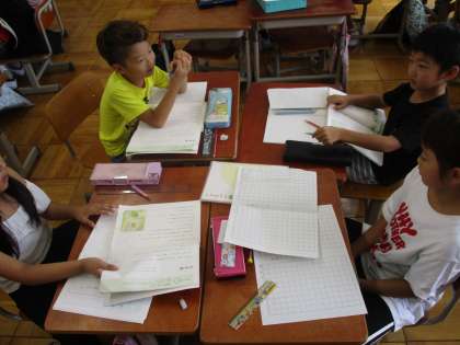 『お手紙』の音読劇に向けて,班ごとに音読の工夫を話し合っています。