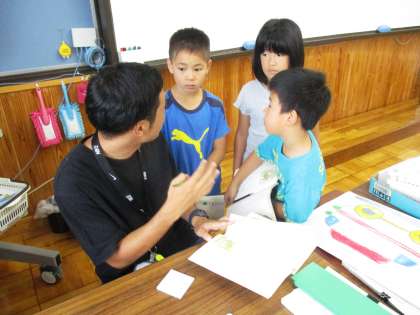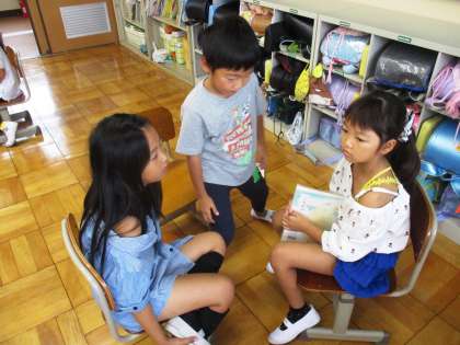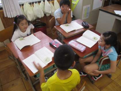 音読劇の工夫について相談しています。