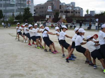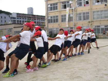 1〜6年生の代表の子どもたちが,力いっぱい綱を引きました。どちらが勝つか分からないほどの大接戦。自然と応援にも熱が入っていました。