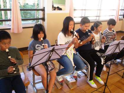 リコーダーで『陽気な船長』『せいじゃの行進』を旋律の特徴にふさわしい吹き方で練習した後,『茶色の小びん』の合奏の練習をしました。