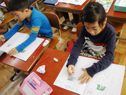 新出漢字の学習をしました。今日は『田』と『川』です。しっかり覚えられるかな?丁寧に練習しています。