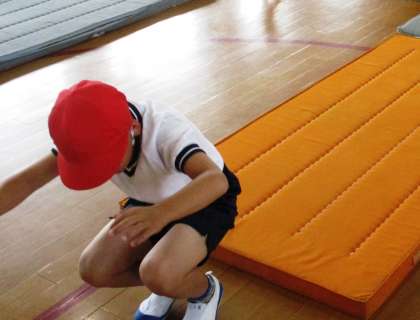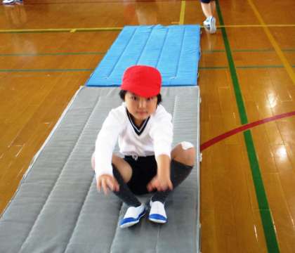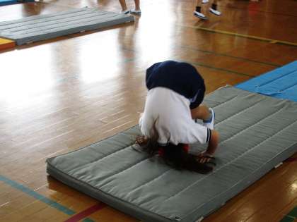 いろいろなポイントに気を付けながら前転の練習をしています。ひざを閉じることを意識するとかっこよく回ることができました。