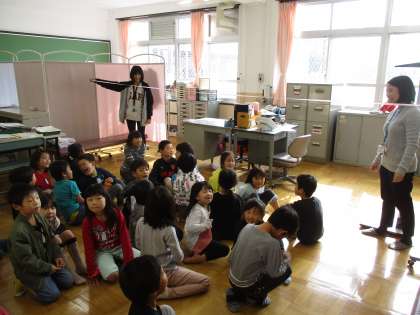 おしゃべりをしている時,咳をした時,くしゃみをした時,それぞれかぜウイルスがどのくらい遠くまで飛んでいるのか,実際に紐を使って再現してもらいました。くしゃみをした時は教室全体にウイルスが飛んでいることを知り,「えー!」と驚く声がたくさん聞こえてきました。