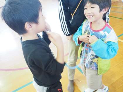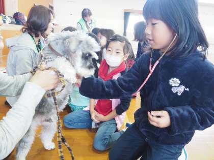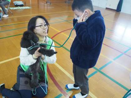 実際に聴診器を使って,自分や友達の心臓の音と,犬の心臓の音を聴き比べました。どちらも「ドックンドックン」という音がしますが,速さが違うことが分かりました。