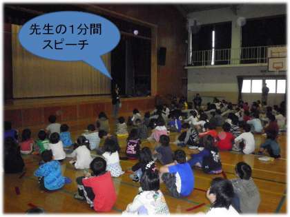 全体集会では,先生の1分間スピーチ(今日は3年の門別小都美先生の「方言のお話しでした)を聞いた後,感想を発表しあいました。
