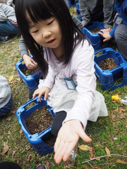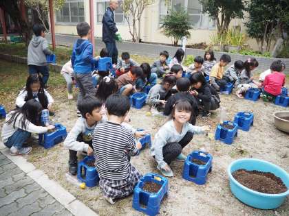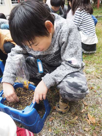来年の春に向けてチューリップの球根を植えました。きれいな花を咲かせるために,雑草を抜いていると,てんとう虫や幼虫を見つけました。
