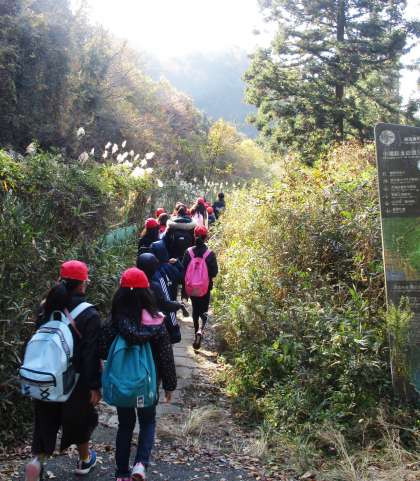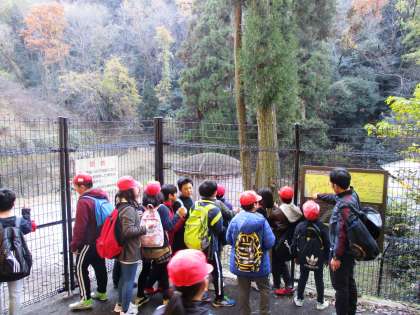 ススキがはえる秋の雰囲気が感じられる細い下り坂をおりて第1トンネル第1竪坑を見学しました。