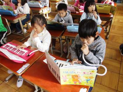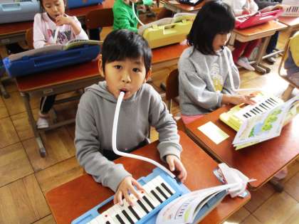 鍵盤ハーモニカで,『かえるのうた』を演奏しています。指づかいに気をつけてしっかり演奏できました。