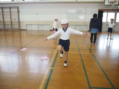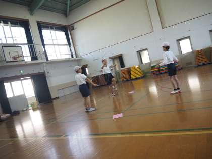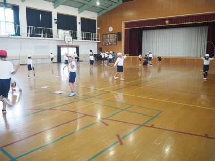 なわとびを行っています。友だちとコツを教え合いながら練習する子や,色々な跳び方に挑戦している子もいます。