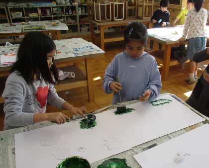 紙版画をしています。ローラーを使いながら,作った版に絵の具を着色していきます。
