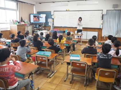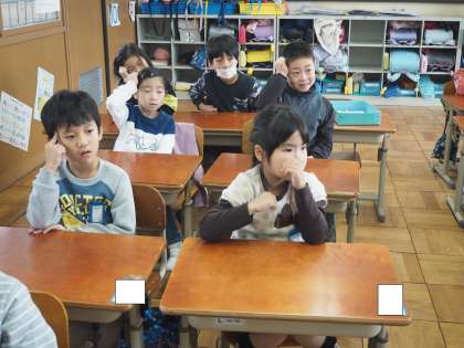 「手話」を使ったコミュニケーションについて学びました。「おはよう」「こんにちは」等のあいさつや,「わたしの名前は○○と言います。」という手話をやってみました。